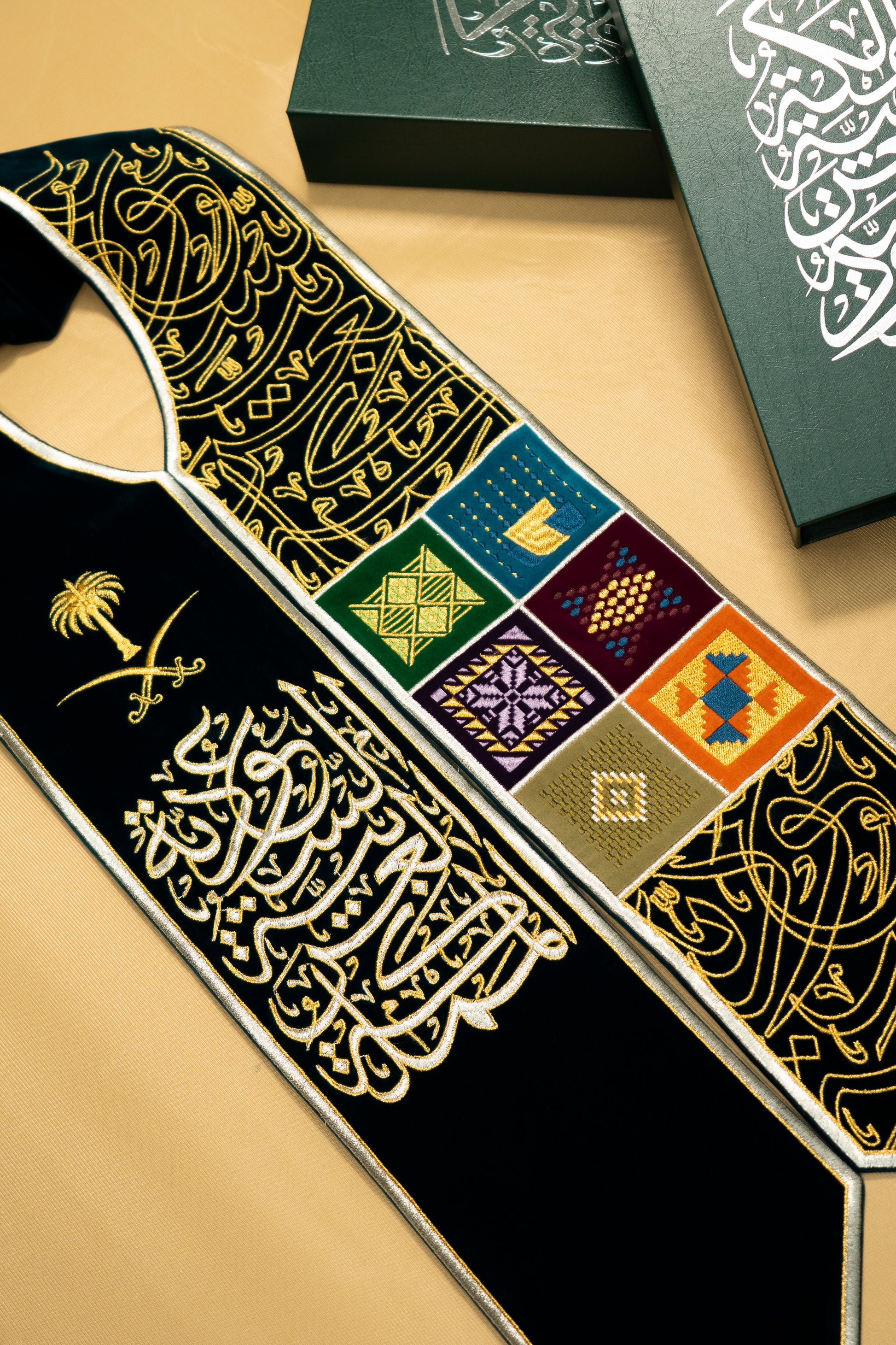 القماش: المخمل الفخم مع خيوط الزري اللامعة في تطريز احترافي دقيق بالخط العربي يعكس الفخامة والأصالة.